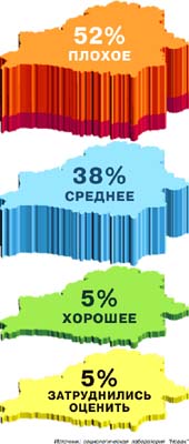 Около трети из них (38 процентов) назвали экономическое положение Беларуси "средним". И только 5 процентов — "хорошим". Остальные (5 процентов) затруднились оценить экономическое положение страны.