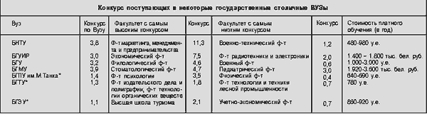 Вообще, поток поступающих трудно контролируем, и предугадать конкурс на ту или иную специальность сложно. Часто высокие прошлогодние показатели тех или иных престижных специальностей отпугивают абитуриентов, и после оказывается, что в этом году на них конкурс ниже среднего. К тому же, все понимают, что если учиться на факультете с «красивым названием», катастрофически уменьшаются шансы трудоустроиться по окончании вуза. Это тоже служит причиной «оттока» от прежних фаворитов. Так, например, можно отметить снижение интереса к юридическим наукам. Но, в то же время, закрепившиеся ранее в таблице лидеров профессии экономиста, психолога и языковеда (точнее, знатока иностранного языка) по-прежнему твердо держат свои позиции. И, тем не менее, всему должен быть предел, верно? Но некоторые цифры просто готовы свалить тебя с ног. Так, например, в Белорусском национальном техническом университете (специальность - мировая экономика) на 5 бюджетных мест подали заявления 182 человека, таким образом, создав конкурс в 36,4 человека на место! На экономический факультет БГУИР (специальность - экономика и организация производства) тоже будут учиться на бюджете только 25 счастливчиков из 245.