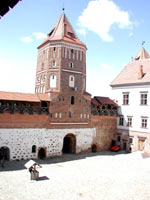 Ровно 20 лет спустя, тоже в октябре, когда еще на деревьях «осень забыла мокрый платок желтой листвы», я снова оказалась в Мире. Настоящая активная реставрация замка ведется с конца 80-х годов прошлого столетия. Первой восстановили юго-западную башню. Теперь там размещены некоторые экспонаты Национального художественного музея, филиалом которого и является замок.