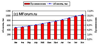 Только за прошедший месяц общее количество новых подключений составило 59,6 тыс. абонентов. С апреля лидером по числу новых подключений в Беларуси является "МТС", подключивший в ноябре 44,3 тыс. абонентов (+12,3%). По размеру абонентской базы лидером на рынке продолжает оставаться Velcom, число абонентов которого превысило 605 тыс. при сравнительно небольшом приросте за месяц +2,6% (15,3 тыс.). Число абонентов оператора стандарта NMT-450 и cdma2000 "БелСел" (Diallog) оставалось стабильным на уровне 20 тыс. Число абонентов нового стандарта (cdma2000 1x в диапазоне 450 МГц начал эксплуатироваться с 6 февраля 2003 года параллельно с NMT) превышает 9 тыс.
