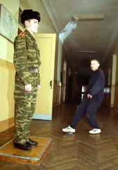 Попасть в армию, как говорится, «неестественным» путем, то есть без повестки родного военкомата, не так-то и просто. Однако нам удалось договориться с Министерством обороны, и меня с коллегой согласились допустить к службе. На один день в 120-ю гвардейскую мотострелковую дивизию. С правом фотосъемки, обедом в солдатской столовой и большими поблажками. Наша служба началась в 8 часов утра в 46-м отдельном разведывательном батальоне - нас определили к самым настоящим разведчикам. Наши «сослуживцы» к этому времени уже проснулись, пробежали 5 километров, умылись и позавтракали